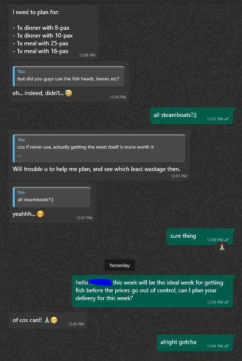 Prices are very volatile for the next two weeks, and some seafood may not be the best quality (e.g. ang kar prawns) as the fishermen are showing less concern about supply chain management. Some prices are so high that it's simply not worth it to order those.